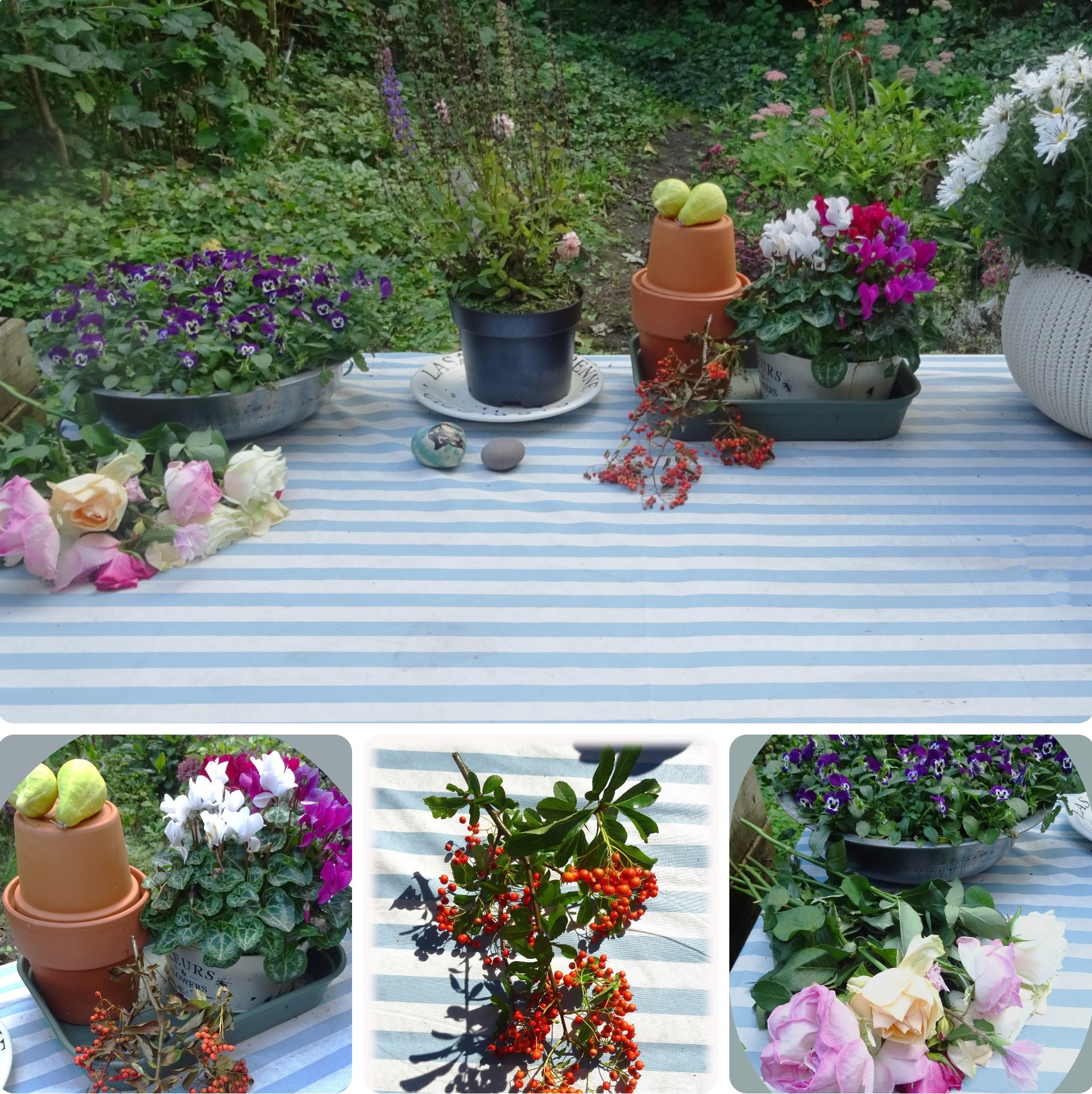 - Ik veranderde de tuintafel in een meer op de herfst gericht. Ik zie al pompoenen liggen, maar dat vind ik nog iets te vroeg. De rode besjes komen van een struik in de tuin. De rozen zijn nog van mijn verjaardag. Ze begonnen lelijk te worden, hier liggen ze nog even mooi.